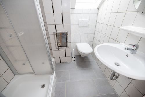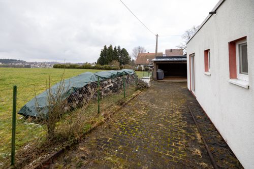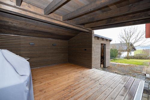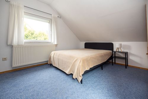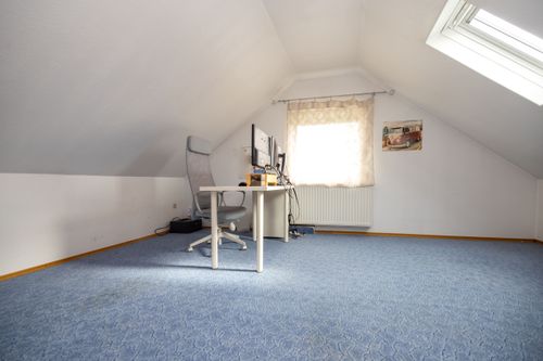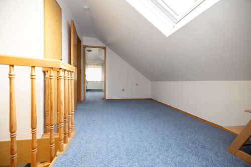 Über eine Holztreppe gelangen Sie in das Obergeschoss. Hier befindet sich ein weiteres Badezimmer mit Dusche und WC, das in 2025 renoviert wurde. Auch hier sorgt eine Fußbodenheizung für zusätzlichen Komfort. Ein Gästezimmer sowie ein Büroraum bieten vielseitige Nutzungsmöglichkeiten, beispielsweise für Homeoffice oder Besucher. Die Dachfenster wurden 2022 erneuert und sorgen für helle, freundliche Räume. Abgerundet wird dieses attraktive Angebot durch zahlreiche Ausstattungsmerkmale im Außenbereich. Die Fenster des Hauses wurden bereits im Jahr 2000 erneuert. Eine Doppelgarage mit elektrischem Funkantrieb bietet komfortables Parken. Im Garten befinden sich ein neu errichtetes Gartenhaus aus dem Jahr 2024, ein Geräteschuppen sowie eine großzügige Zisterne mit einem Fassungsvermögen von 10.000 Litern. Eine rund um das Haus installierte Drainage sorgt zusätzlich für Schutz und Werterhalt der Immobilie.